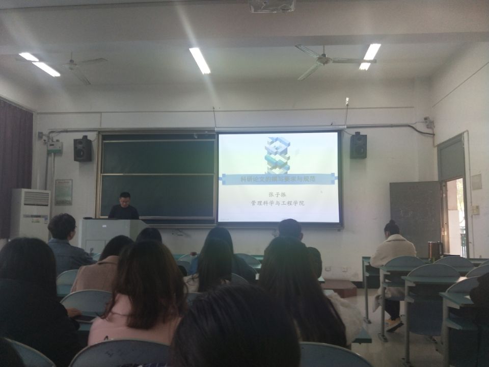 本次邀请学院信息管理与信息系统系张子振副教授与广大学生展开交流。张子振老师以“科研论文撰写规范”为题,从科研论文选题的确定、问题解决的办法、科研论文的创新以及科研论文撰写框架等方面为同学们进行了详细讲解。张老师不仅详细介绍了科研论文写作的基本规范,还结合自身科研经历向同学们传授论文写作的方法和技巧。