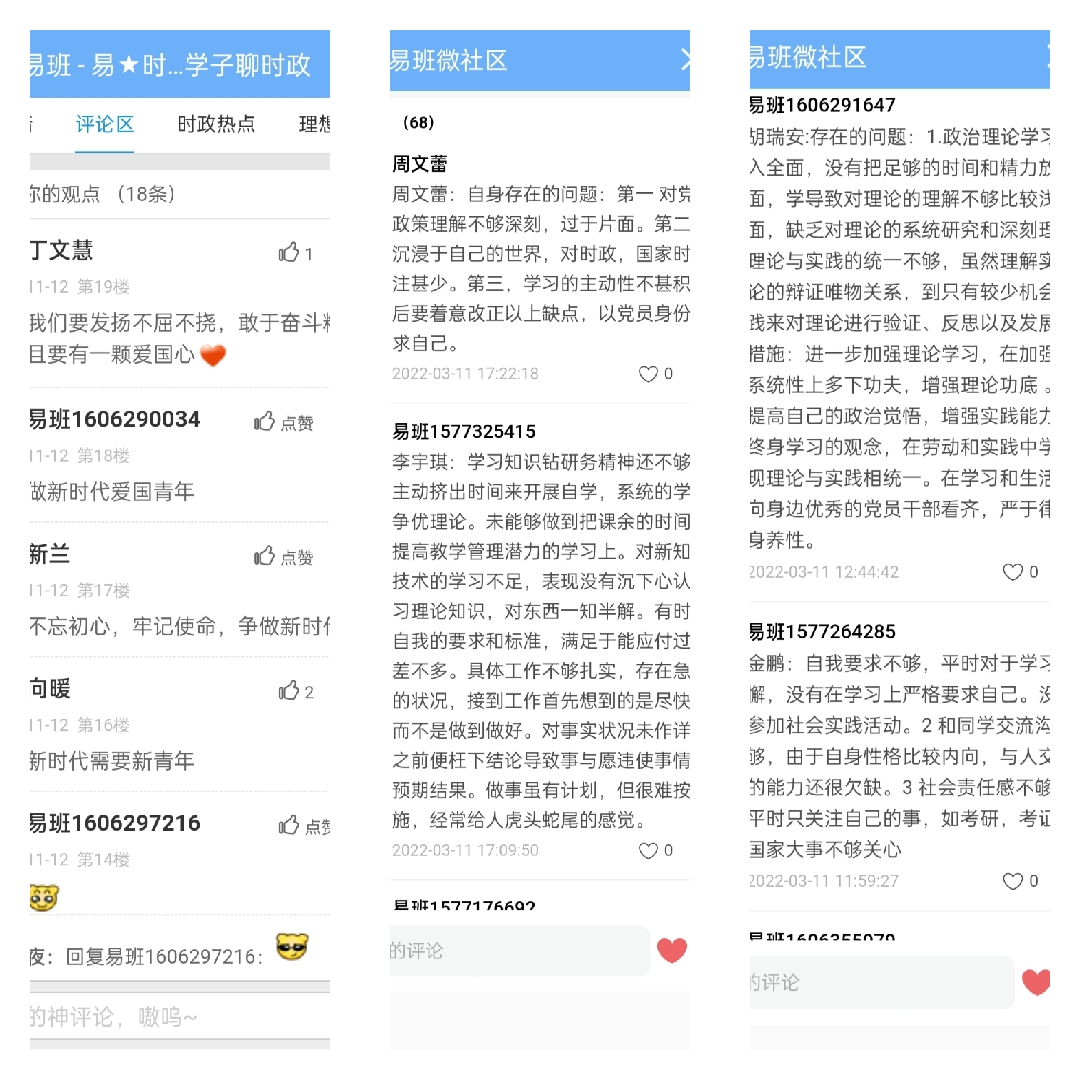 截至当前,计科二支部时政专栏共发布相关学习文章30余篇,支部全体党员参与理论学习,发表个人观点1000余次,在支部形成了良好的理论学习氛围,进一步强化了支部党员的思想政治理论素养教育。