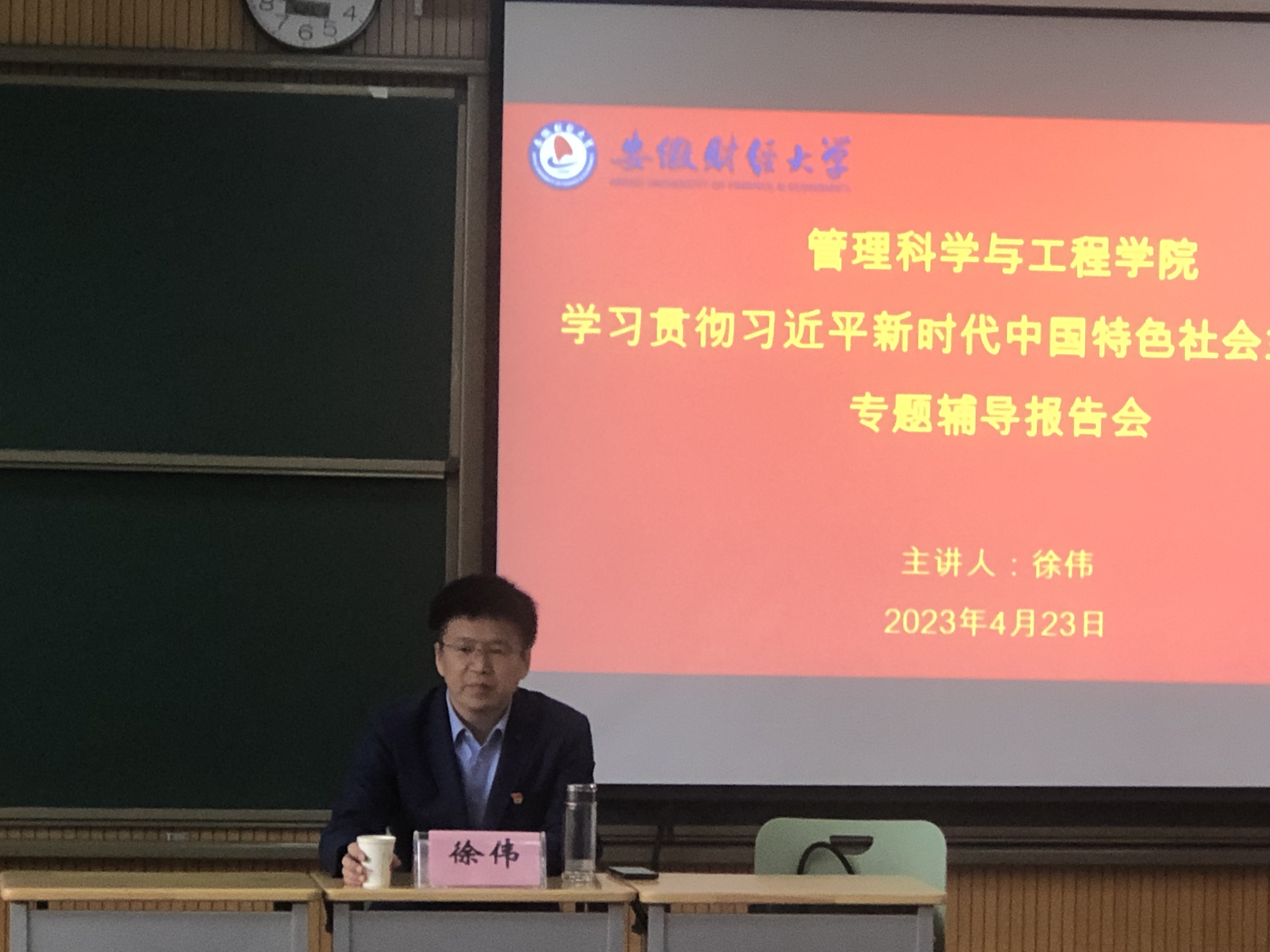 动员大会后,学院特邀马克思主义学院副教授徐伟博士为全体党员作了“以中国式现代化全面推进中华民族伟大复兴”专题学习辅导报告。他分别从党的二十大召开的历史背景、新时代党的中心任务、中国式现代化的本质要求、前进道路上必须牢牢把握的五条重大原则等四个方面详细解读了学习贯彻习近平新时代中国特色社会主义思想主题教育的重大现实意义和深远历史意义。