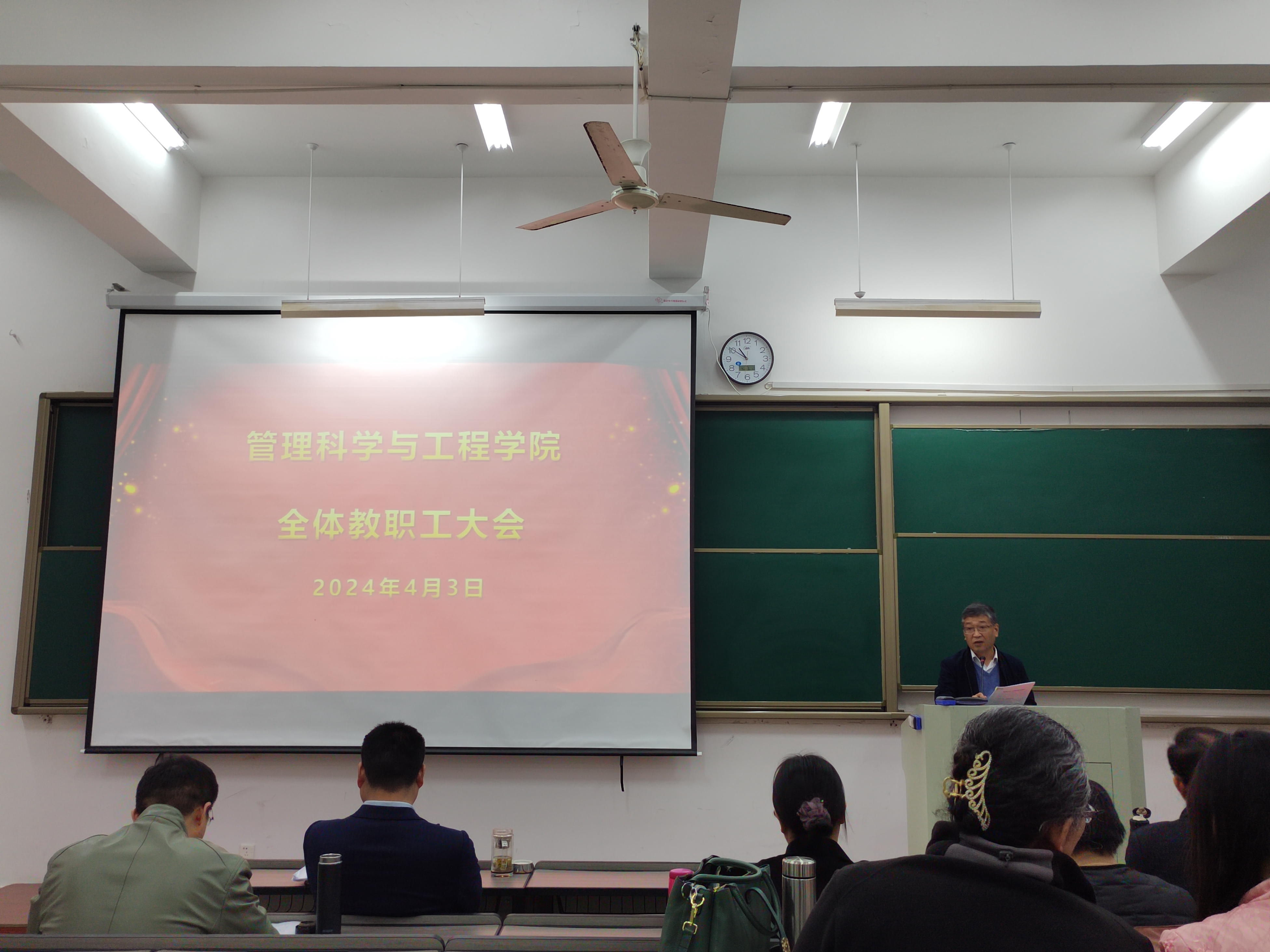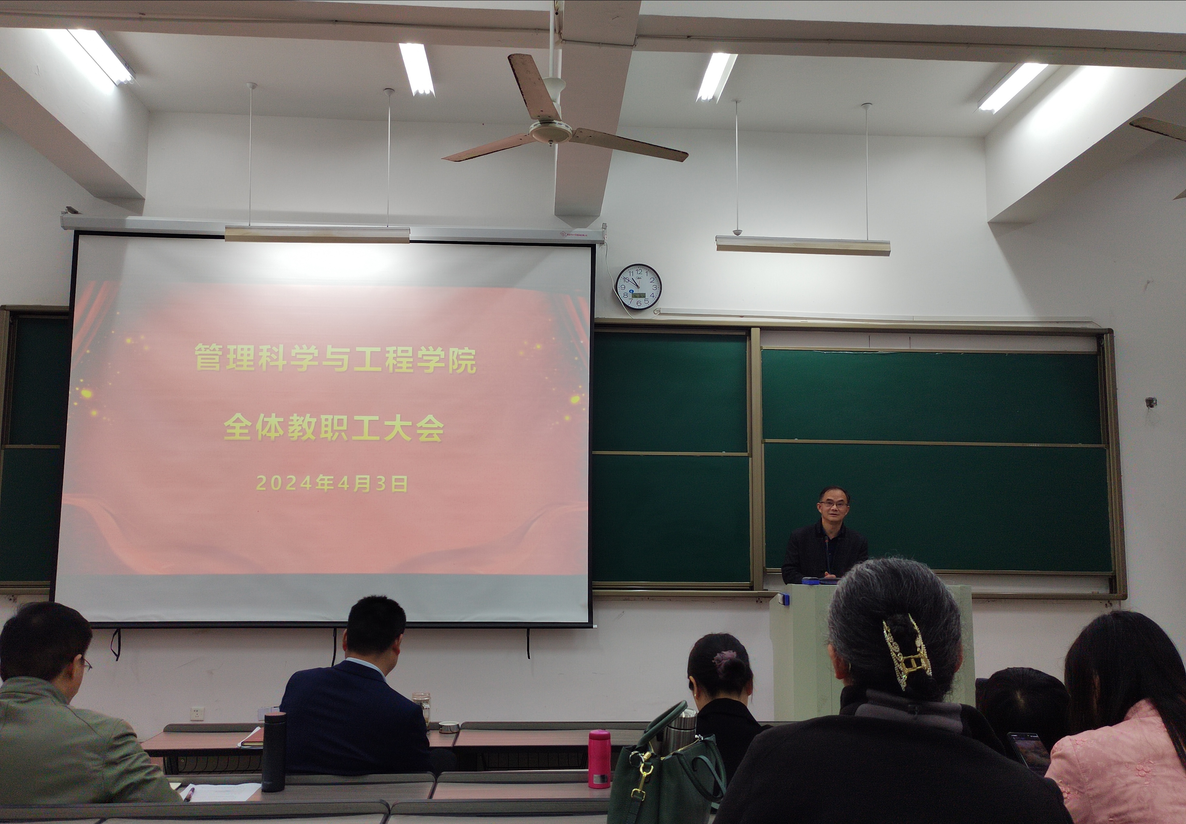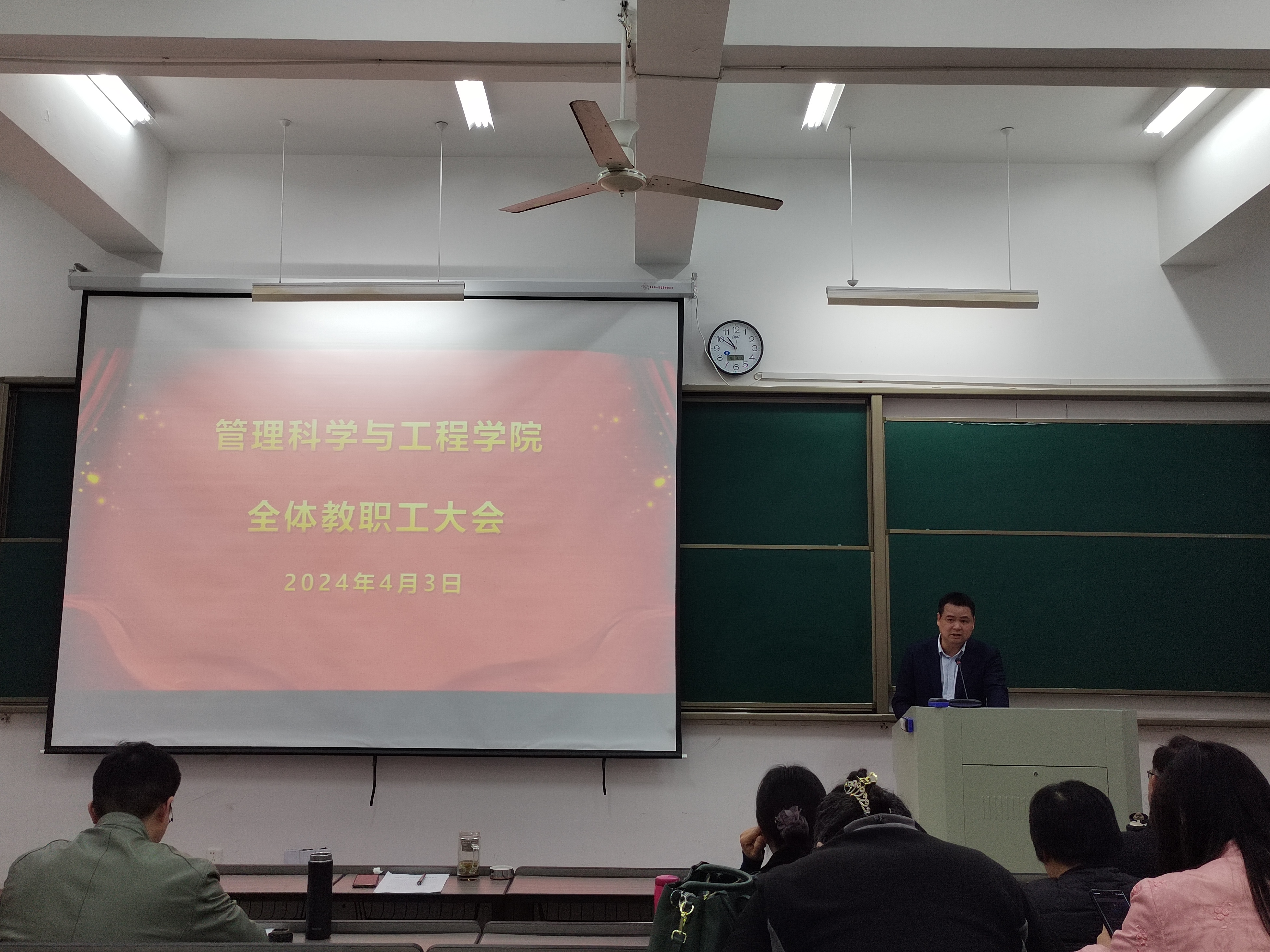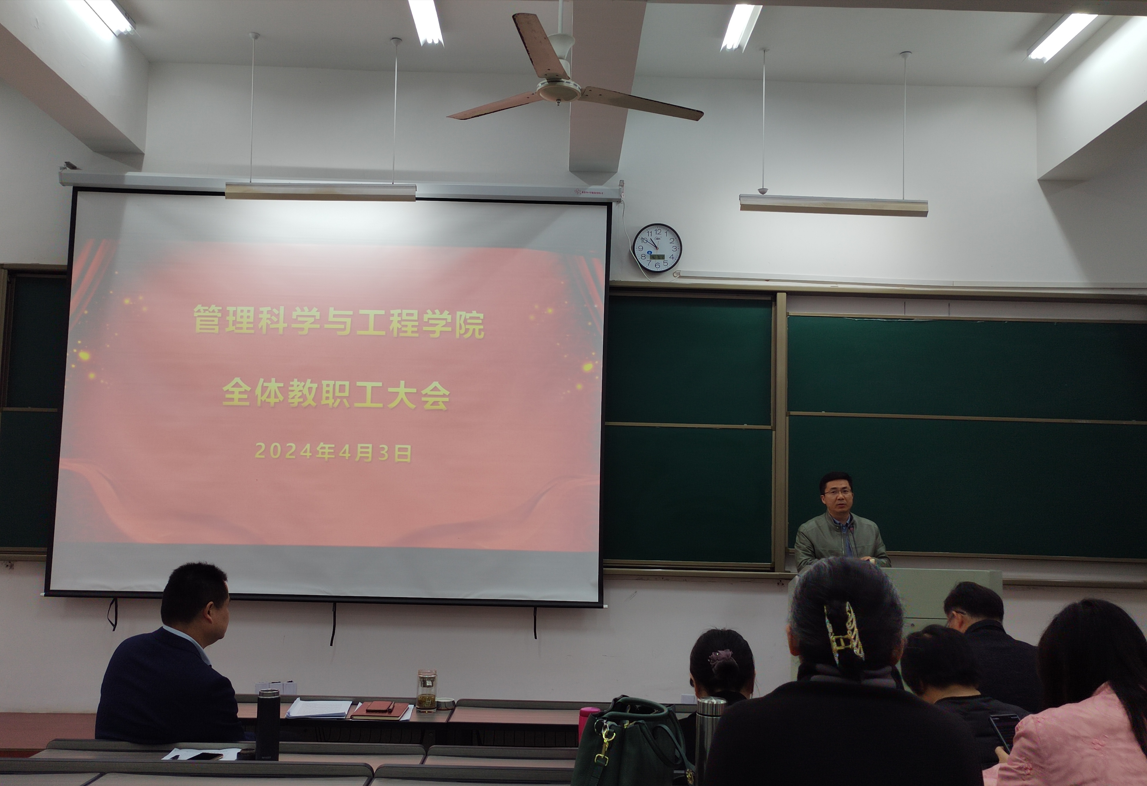 4月3日下午,我院在广学楼101教室召开全体教职工大会暨政治理论学习会,会议由学院党委副书记刘朝新主持,全体教职工参加会议。