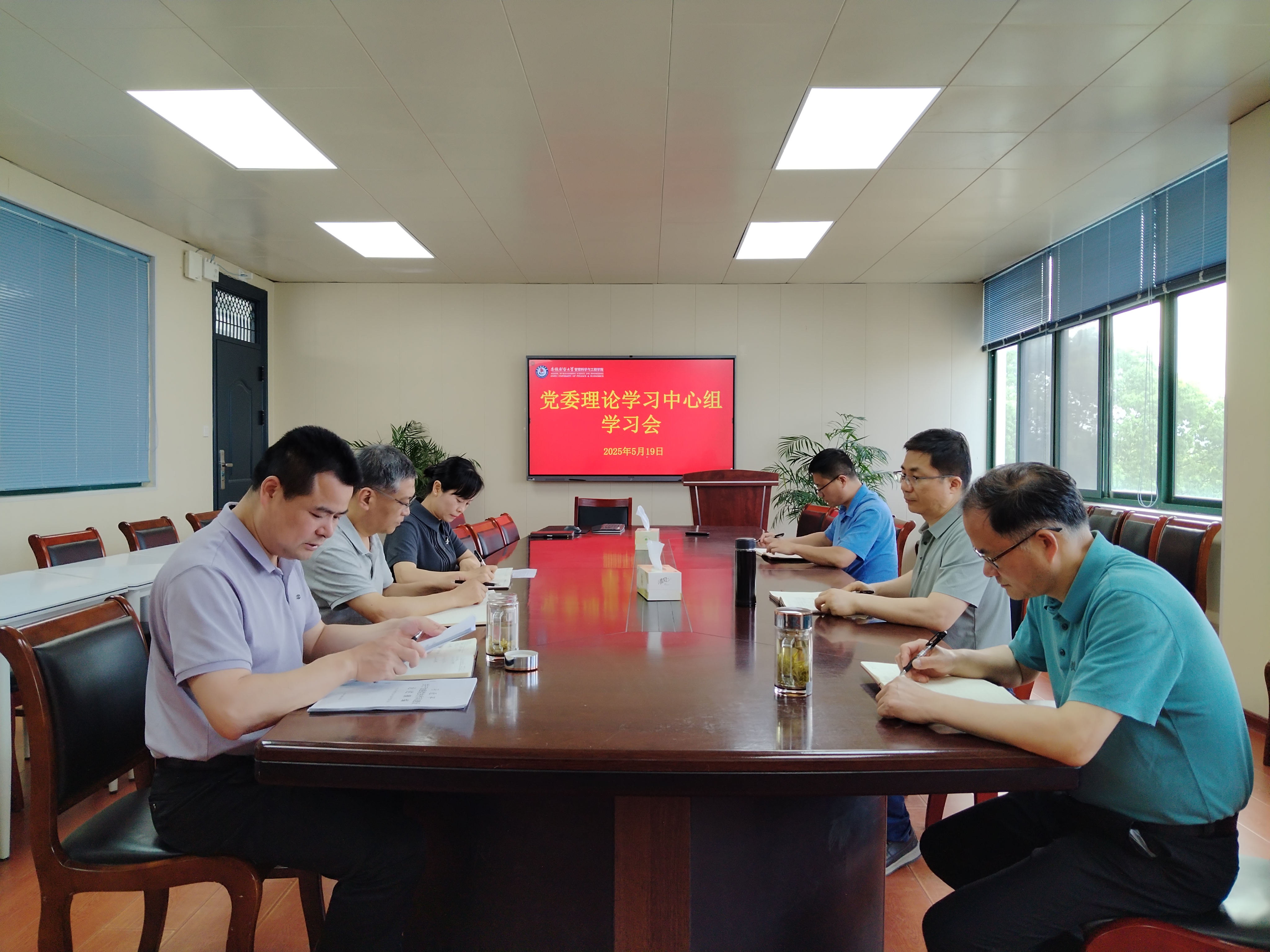 5月19日,学院党委理论学习中心组在广学楼303会议室举行2025年第五次集中学习,学院党委委员、党政领导班子成员参加会议,会议由党委书记刘朝新主持。
