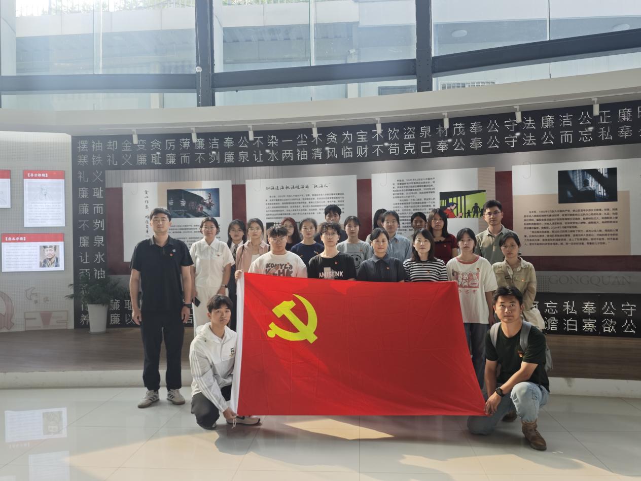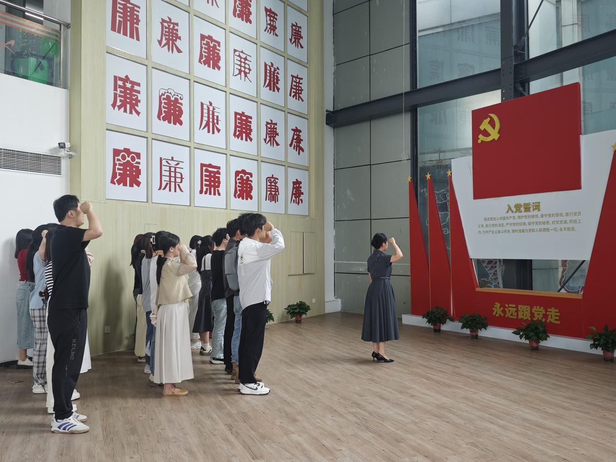 在庄严肃穆的展厅内,师生党员在讲解员的引领下,依次参观了警钟长鸣、以案为鉴、以史为鉴、政治巡察、党建引领等展区。一个个发人深省的违纪违法典型案例,落马官员的忏悔画面,对参观党员来说是一场触及灵魂深处的廉洁洗礼。参观结束后,全体党员在学院党委副书记樊元华的带领下,面向鲜红的党旗,庄严举起右拳,重温入党誓词。铿锵有力的誓言在展厅内回荡,不仅是对入党初心的深情回溯,更是毕业生党员即将奔赴新征程之际,对忠诚、干净、担当的坚定承诺与庄严宣告。