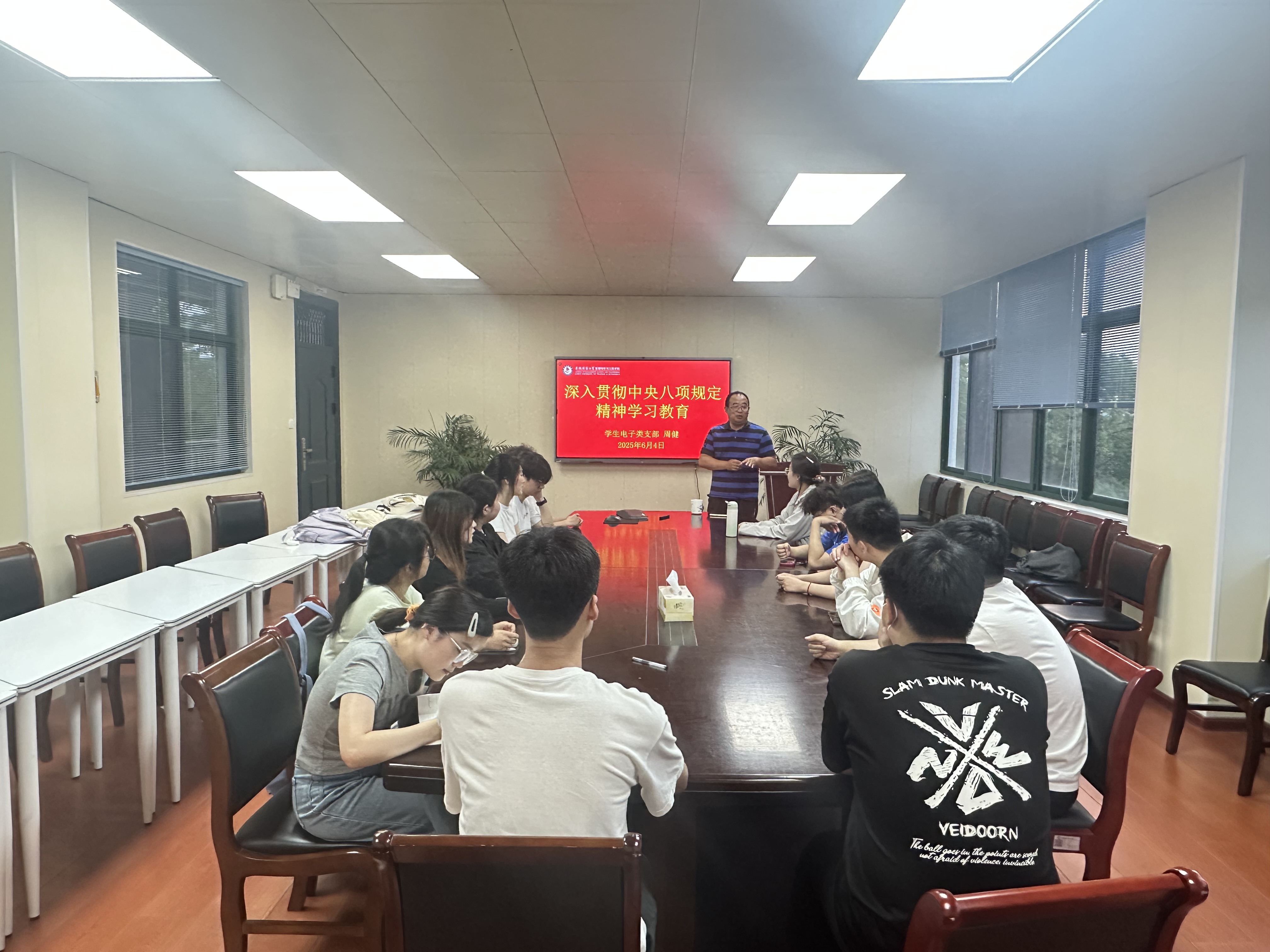 丁莹传达了中央层面深入贯彻中央八项规定精神学习教育工作专班、中央纪委办公厅关于2起党员干部在学习教育期间违规吃喝、严重违反中央八项规定精神典型问题的通报,带领学生党员认真学习了省委常委会议精神,并警示全体学生党员要以案为鉴、警钟长鸣,不断增强纪律意识、规矩意识,确保在学习科研、社会实践、学生工作等各方面都做到清正廉洁、遵规守纪。