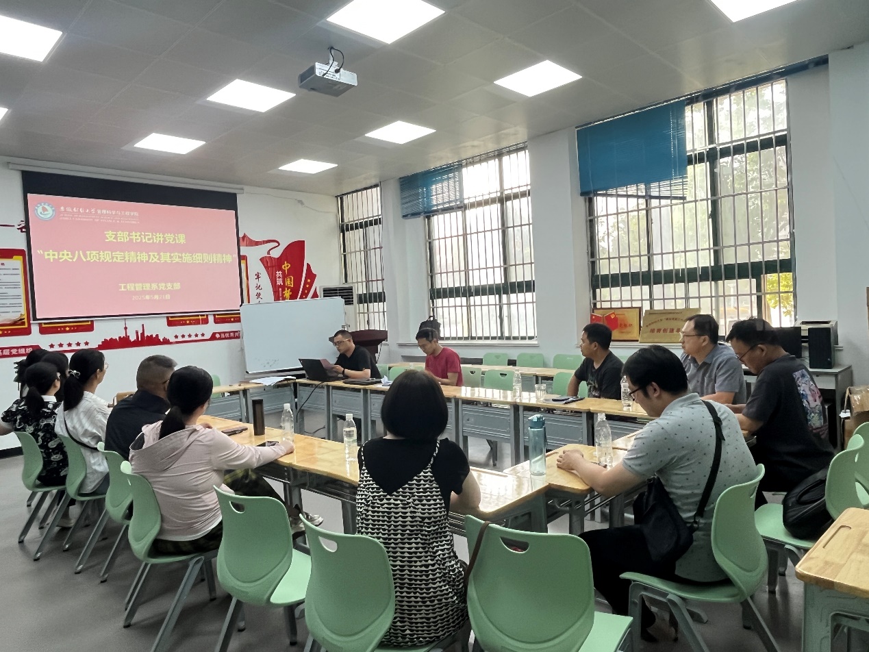 为扎实开展深入贯彻中央八项规定精神学习教育,2025年5月21日,工程管理系党支部在广学楼103教室组织全体教师党员,开展“深入学习贯彻中央八项规定精神及其实施细则精神”专题党课学习活动。本次党课由党支部书记王志远主讲,旨在引导全体党员深刻领会中央八项规定精神实质,将其内化于心、外化于行。